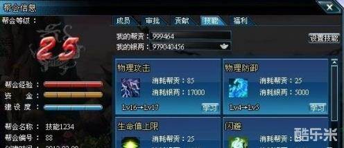 帮会技能所提供的都是基本属性的提升,包括物理攻击,物理防御,生命值上限,闪避,命中,会心,法术攻击,法术防御,法力值上限等。通过消耗银两和帮贡来提升每个技能的等级。