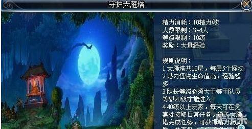 在对话选择“守护大雁塔”进入活动界面。 大雁塔共10层, 每层5个怪物,塔内怪物生命值高,