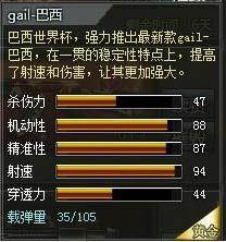 小编点评:巴西世界杯,强力推出最新款gail-巴西,在一贯的稳定性特点上,提高了射速和伤害,让其更加强大。
