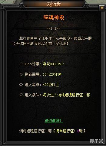 升到400级后可在铁血主城守护噬魂神殿的顽固老头处进入,进入需要噬魂通行证,可通过打怪或商城购买得到进入。