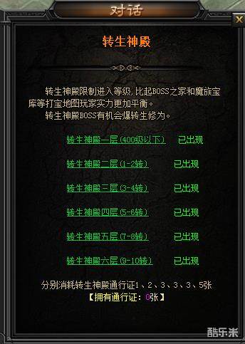 不同转生等级可进入对应的转生神殿地图。击杀转生神殿BOSS可获得转生经验和材料。