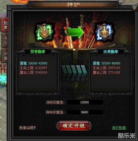 玩家可通过点击“神炉”按钮升级勋章,灵石和护盾。