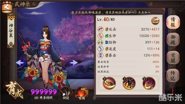 魂9对山兔的速度有了要求,5星速度强化满,大佬的玉藻前在这一层要看配速,是否能吃到星,这里提供一个萌新单过魂9的阵容,丑女,山兔,座敷,大佬玉藻前以及一个狗粮。