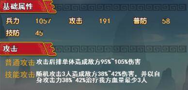 兵力1057,攻击191,普防58,技防45.一个一般般的属性。