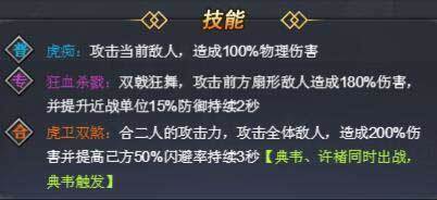 技能狂血杀戮:双戟狂舞,对前方扇形敌人造成180%伤害,并提升近战单位15%的防御持续2秒。