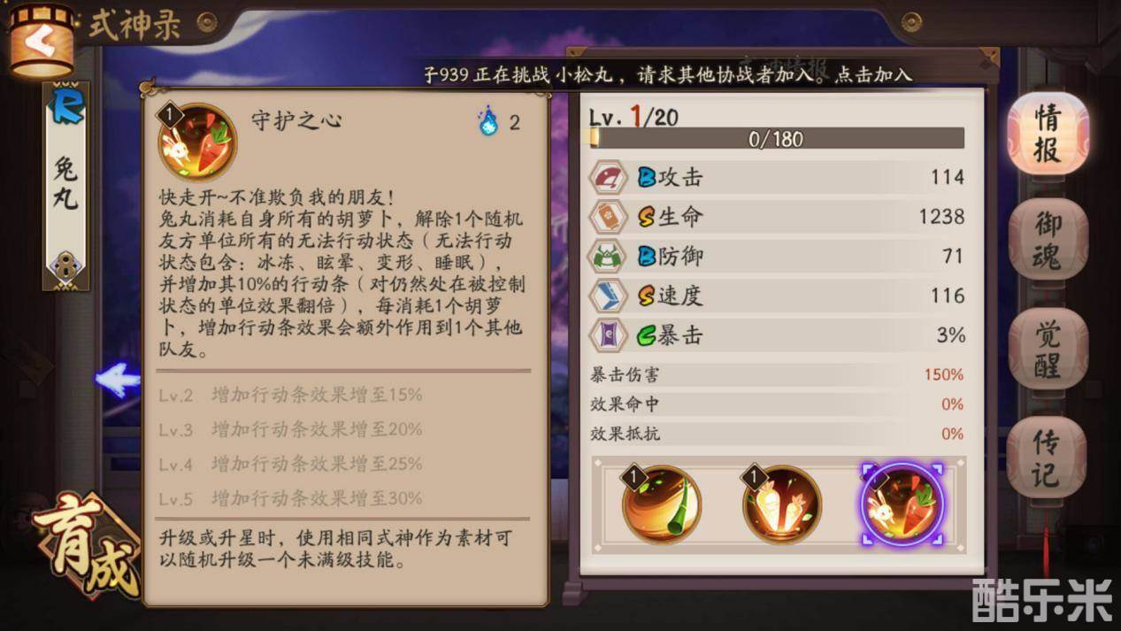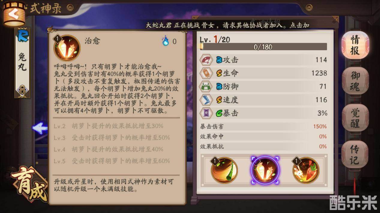 这可以说是兔丸的核心技能,释放后能解除随机一名队友受到的所有无法行动状态,包括眩晕和变形都可以解除。所以兔丸在面对强力控制式神时,能发挥意想不到的效果。而且每一根胡萝卜都可以为队友增加行动条,解控的同时还拥有了拉条的能力,让兔丸辅助的本领更上一层楼。但是兔丸最多只有4根胡萝卜,所以拉条能力不算稳定。如果没有胡萝卜将不能释放大招。而且只能随机解除一名队友的无法行动状态。所以兔丸是比较克制单体控制式神的。