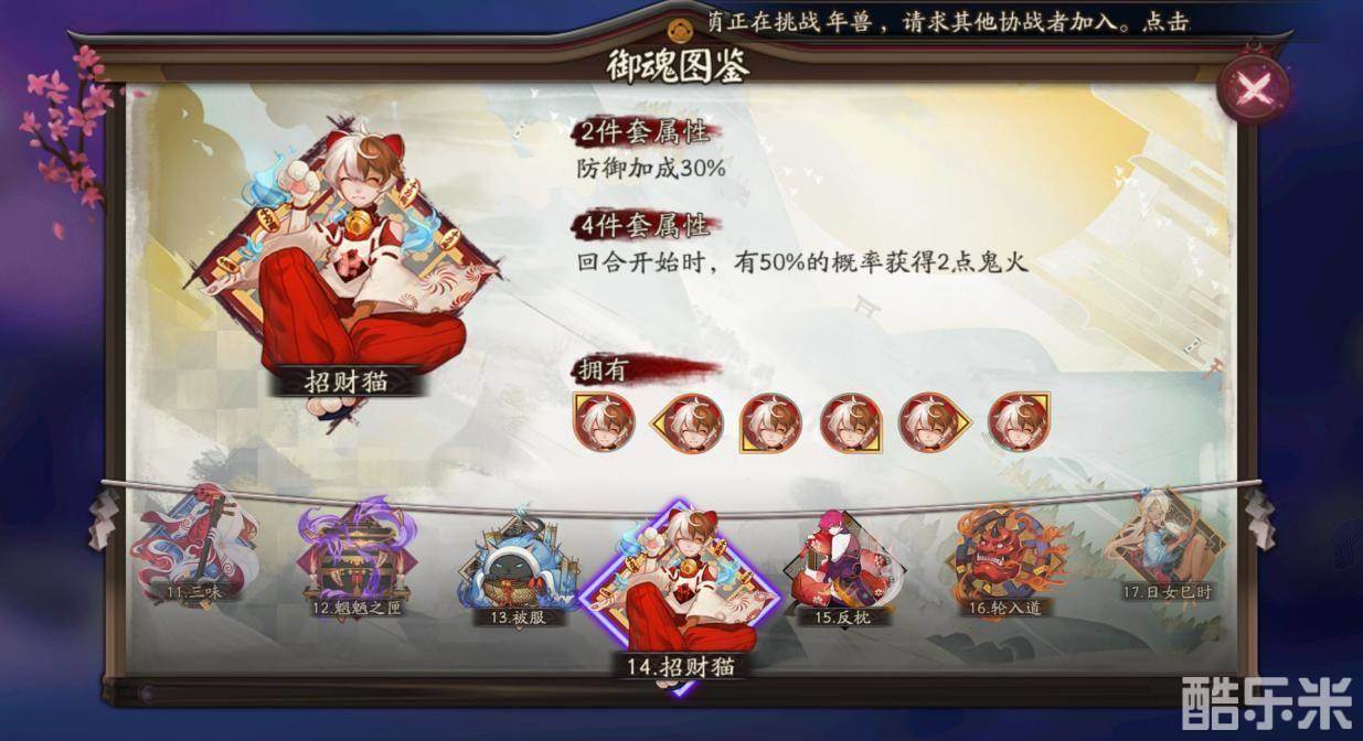 招财猫御魂在回合开始时,有50%的概率可以获得两点鬼火,兔丸的大招只需要两点鬼火就能释放,完全可以自己供应鬼火,省下大部分鬼火供其他式神使用。