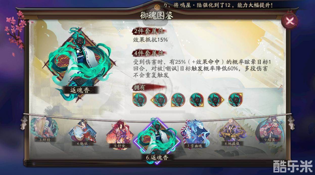 返魂香套装属性中增加了效果抵抗,兔丸携带后效果抵抗将更高,而且携带返魂香的兔丸受到攻击时,会有一定的几率眩晕攻击者,让兔丸在场上有一定的控制能力。