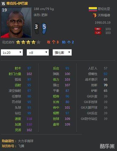为啥?这哥们的射术惨不忍睹,单刀中柱也是时有发生,主要是前锋一般不要去选择妖人,大牌球星更稳妥一些,而伊巴波在右边锋位置上的速度优势绝对让对手头疼,经常上演一条龙破门,小编傻*吧,刚说了他射术惨不忍睹,又开始吹。不不不,这哥们还有个绝技,爆射稳如狗,经常能够进一些让你惊喜的进球,不是内切,是生切!不要射术,坚信大力瞎抡出奇迹,看似傻*,但的确是这个球员的真实写照。等级上去后他的传中并不会很差,在这个QW的年代里,超快的速度会给伊巴波更多的传中机会。