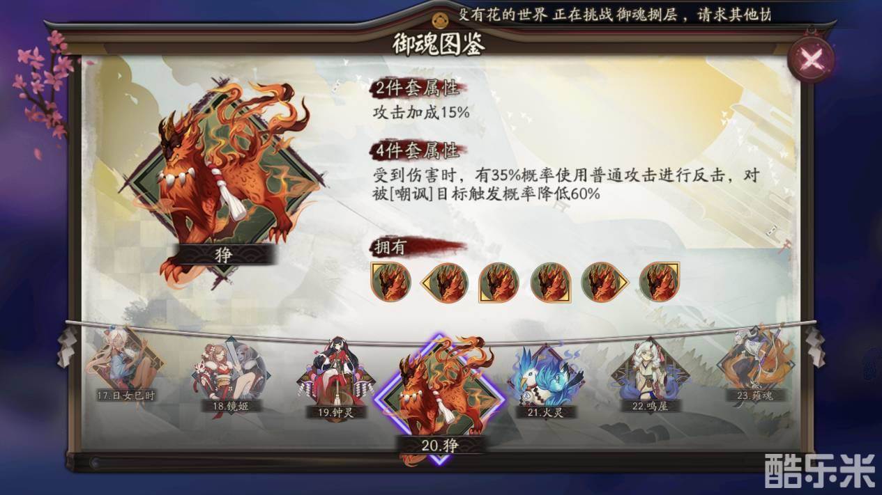 以前一直是说某个式神应该搭配什么御魂,但是反过来说某个御魂搭配什么式神有好的效果,也是一种反向思维。狰,这个御魂获得触发概率的条件是,佩戴铮四件套的式神受到直接伤害,或椒图链接时受到的伤害有35%的概率使用普通攻击反击,但是会对被嘲讽的目标降低60%。狰几乎可以说是沾边儿就有概率触发御魂效果,所以,狰才深受广大玩家们热捧。