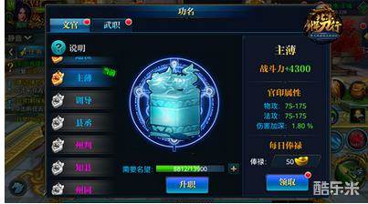 《北凉悍刀行》中,功名分为文官和武职两种,而相对应的提升官职则需要通过不同的途径。文官从白身直到帝师,中间有十几个等级,每个等级官印都可以加战力和角色属性;武官是从平民到大将军王,同样中间也有十多个等级,每一级都有强力的属性加成和战力加成。每日你都可以在功名之中领取文官和武职的俸禄,升级可以领取两次哦。