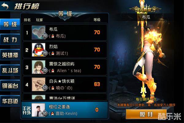 等级排行榜是根据玩家的等级排名的,可查看前20名各位大神的等级。,还可以查看自己的排名。如果在前20名中有你的名字,就恭喜你上榜了! (可每天膜拜得金币哦)