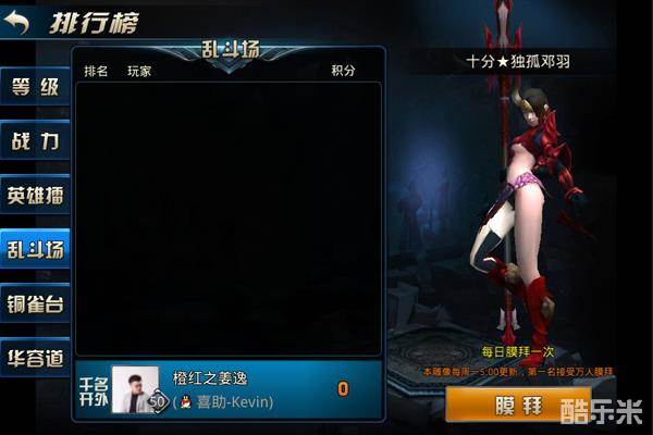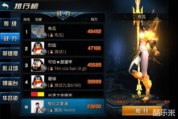 排行榜包括等级、战斗力、英雄擂、乱斗场、铜雀台、华容道。玩家每日可以膜拜排行榜第一的玩家获得金币和经验的奖励,在这里点击排行榜上的玩家也可以看到各路大神们的角色属性和装备等信息。