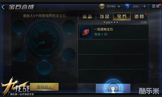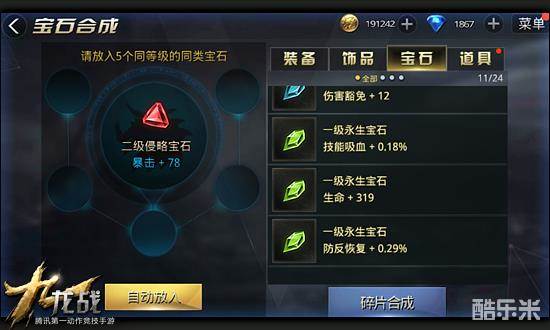 宝石合成系统中,不仅可以对宝石碎片进行合成,还可以进行宝石的合成。玩家背包中若有5个同等级的同类宝石,点击【自动放入】即可进行宝石合成了。通过宝石合成可以提升宝石的等级,合成二级侵略宝石可以消耗5个一级侵略宝石,并消耗金币进行合成,合成后会得到一个随机属性的二级侵略宝石。