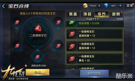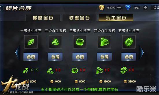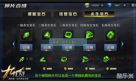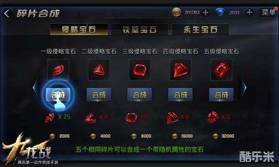 5个相同的宝石碎片可以合成一个带随机属性的宝石,每个等级的宝石都有可能合成不同颜色的随机属性。收集一定数量的宝石碎片后,点击【合成】并消耗一定的金币来进行碎片合成。合成碎片等级越高,所需要消耗的金币也就越多。