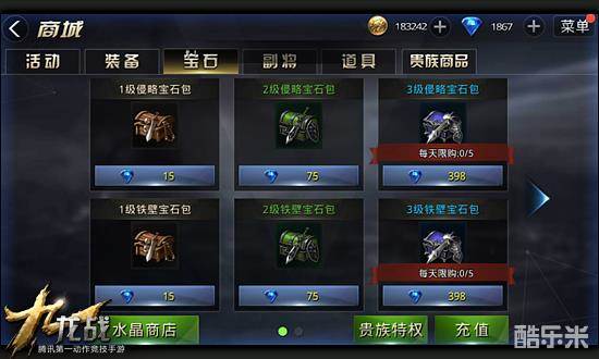 玩家可以通过宝石碎片合成获得宝石,也可直接在商城购买一级、二级、三级宝石包,打开后可随即获得1个对应级别的宝石。