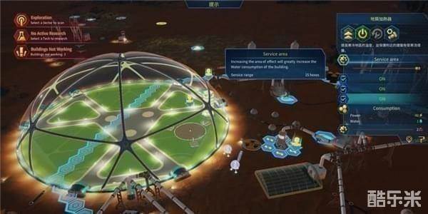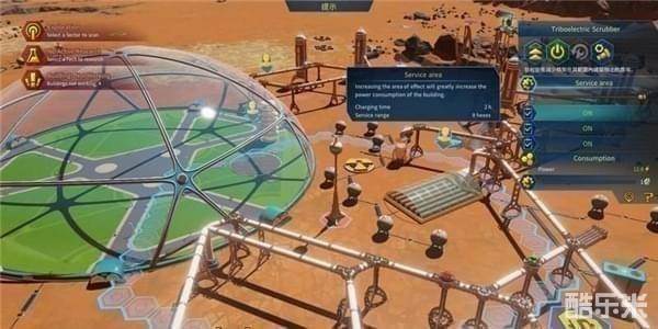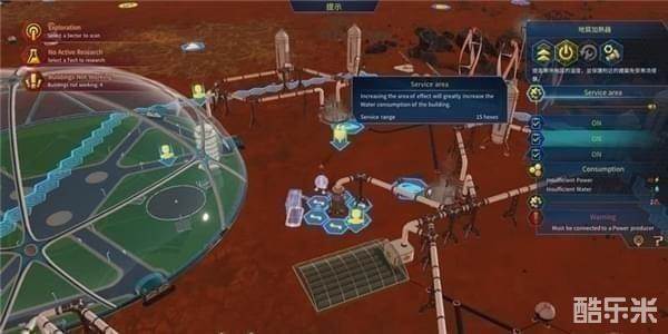完成地质加热器的水、点供给后,它便可以开始工作,单击此设备,在屏幕右上角出现的设备栏内滑块可以调节该设备的作用范围,其工作耗能(电能)也会因工作范围增大而提升(0~40)。