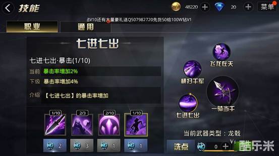 七进七出是游龙职业的典型攻击手段,典型的攻击技能。七进七出的连击及冷却是比较重要的两个副技能,也是对游龙这个职业最有增益的两个职业技能。相比较而言,暴击和伤害就显得比较弱势,并且对游龙这个行业的增益明显的有所不足,不过简单的提升一点暴击和伤害的技能点还有有必要的的。鉴于此小编建议游龙职业的加点技巧如下: