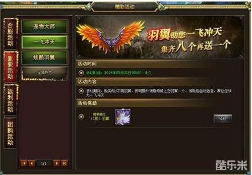 有一个“一飞冲天”的长期活动(何为长期?就是在满足条件前都会给你一直保留噢,满足后才会消失),只要你购买8对不同的羽翼,就可以在这里领取比较浪漫绚丽的特色羽翼“倾城之恋”了,可儿很喜欢这翅膀的,够大够瞩目!当然,冲着这名字,也是爱不释手的说。。。