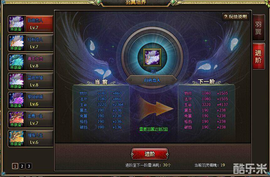 接下来是翅膀升阶,这个是需要用到羽灵精魄的,升阶有什么效果呢,就是在你翅膀原基础上再加一成的属性,提升更为强大的属性!翅膀分为0阶白色,一阶青色,二阶蓝色,三阶紫色等阶级颜色划分,其中白色为最低,一阶一阶堆加下,最高阶的翅膀堆加的属性,更是非同凡响,加油吧,伙伴们!