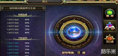 我们追求更强的脚步总是永不停歇的。把符文镶嵌上我们手中的神器后,就要想办法把它们的镶嵌之力变得更为强大!符文封印系统就是这样一个满足我们更强贪欲的系统,在这里你只要通过符文封印石进行封印,也可是说是封印,你已经镶嵌的,六级或以上的符文就会有特别属性加成!注意是百分比加成,提高封印等级,百分比加成也更为变态!你怎能错过!