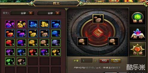 那么如何才能产生出六级以上的符文呢?当然是最为常规也是最为简单的方法,合成。在这里的规则倒是十分简单,只要你把两颗相同的符文放到合成器之中,就可以点击“合成”合出一颗更高级的符文。当然,本作还为你提供了更智能化的系统,在界面右下方选择“将背包的符文合成到:等级”,选择你想要的符文等级,只要你材料足够,就可以把背包里的所有符文一键合成到你想要的等级符文,方便快捷,一键搞掂!