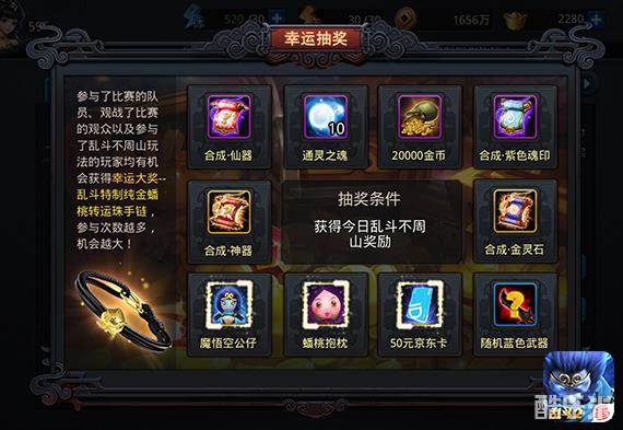 此外,在线上赛结束之前,参赛选手只需完成要求的比赛场次,非选手完成要求的观战场次、或参与不周山战场的战斗,将有机会参与惊喜大抽奖,其奖品包括魔悟空公仔、蟠桃抱枕、50元京东卡等实物奖励。线上赛结束后,系统还将抽取1名幸运大奖,向玩家送出《乱斗西游2》特制的纯金蟠桃转运珠手链。玩家参与抽奖的次数越多,最后获得幸运大奖的机会就越大噢!