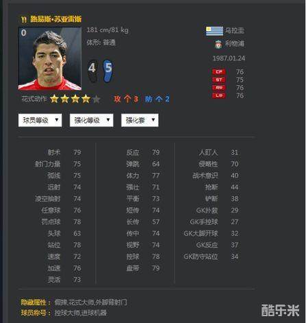 补充说明:相对于本泽马更偏重于风骚跑位,苏亚雷斯则可以用全能战将来形容,这个不光可以通过属性可以体现,而且现实中还可以咬人,不会咬人的前锋不是好后卫啊,开个玩笑,总之这个球员很多赛季卡都可以发挥很大的作用。