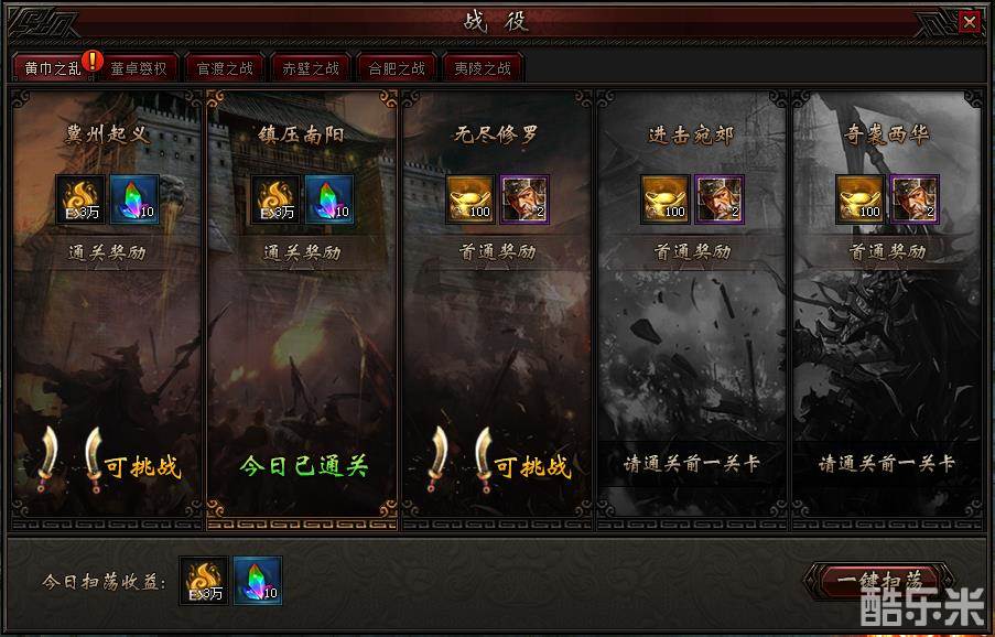 战役玩法介绍战役系统按玩家等级依次解锁。首次通关奖励可获取武将碎片与绑定元宝。是集齐武将的重要来源。玩家进入副本,需击败副本中三个目标BOSS从而获取胜利。若挑战时间超过15分钟,则挑战失败。系统每日24:00重置,玩家每天可免费通关一次,首次通关之后该副本可扫荡获取奖励。通关失败无奖励,也不会限制挑战次数。挑战成功后,通过系统面板发放奖励,若背包已满则会发送邮件给玩家。
