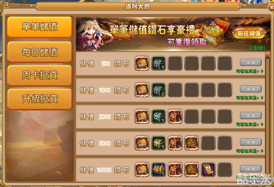 充值10000+钻石:5倍经验卡*2个、4级攻击宝石箱*1个、攻击药水箱*5个、2级坐骑缰绳*3个、40%保护符*1个