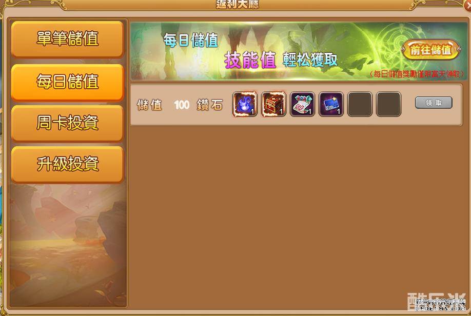 每次累计充值满100钻石,可以领取:4万技能值、攻击宝箱*1个、冰宫卷轴*1个、1.5倍经验卡