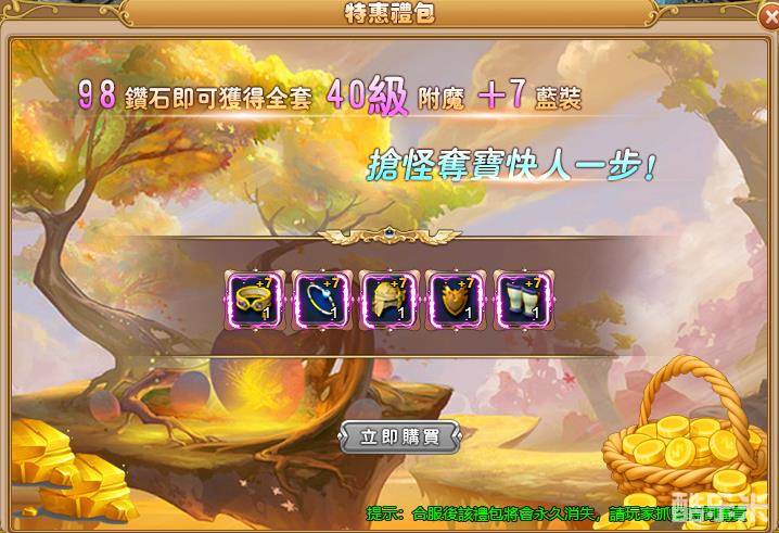 特惠礼包中拥有腰带、手镯、帽子、盾牌、护膝这五件装备,同时这五件装备是40级蓝色装备,在游戏的中前期属于打boss必备装备之一,并且每件装备附魔都达到加7的高度,对于新手玩家来说这可是非常难得的属性。