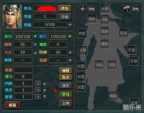 玩家在”将领”界面选择自己的君主将并打开界面,然后点击“学习”即可。