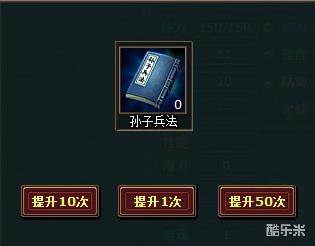 君主将提升修为需要使用“孙子兵法”,而使用“孙子兵法”是有一定成功几率的,但无论失败成功,都将消耗一本孙子兵法。玩家可以选择提升1次、10次或者50次进行快速提升修为。如图: