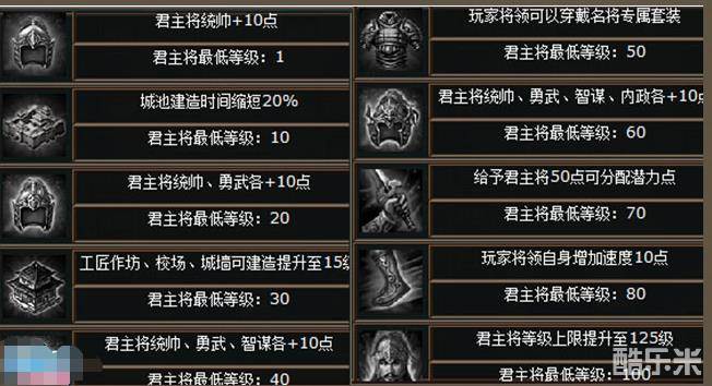 君主将的修为等级越高,君主将的品质也会跟着改变。品质分别为白、绿、蓝、紫、橙和红色。修为升到一定等级时,可以获得相应的聊天频道称号。在“过关斩将”中,每一层也都会有君主将修为的等级限制。而君主将等级与修为等级是挂钩的,例如:当玩家修为等级已经达到3级但是君主将等级未到30级,则无法再继续进行修为提升。同时,提升修为和君主将等级还可以获得额外的奖励,这些奖励无论是对城内还是城外,打剧情过副本还是在外征战都很实用。具体如下图: