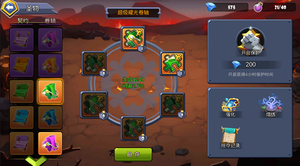 如果只有一个圣物碎片又不能合成,怎么合成圣物?直接抢夺!在圣物系统里,只要各位勇士得到一个圣物碎片就有合成圣物的机会,通过圣物系统里抢夺玩法,通过消耗体力抢夺其他玩家的碎片以达到目的。虽然过程很粗暴,但是结果很美丽,建议各位勇士一次性抢10次,获得碎片的概率会提高很多。如果自己的碎片不想被其他玩家抢夺,可以消费砖石开启保护圣物的功能,砖石可以没有,但圣物碎片万万不可以没有!