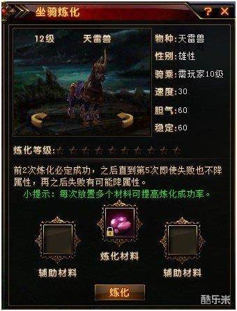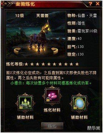 任何坐骑一经炼化后则会与角色绑定,将不能再进行任何交易;炼化的前2次必定成功,之后直到5次即使失败也不会降属性,5次之后的失败概率很高,失败后会降炼化材料的相应属性(即:若炼化材料是增加5点胆气,若失败则不升反扣5点胆气)