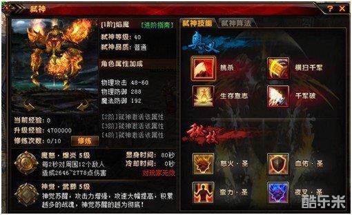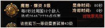 弑神技能:每个弑神均拥有天生技能“魔怒”以及“神觉”,魔怒即为玩家可以主动释放的弑神群攻技能,战斗中杀怪吸怒积累,积累满后就可以释放。弑神每升级到3级、13级、23级……以此类推,将会自动升级魔怒技能!
