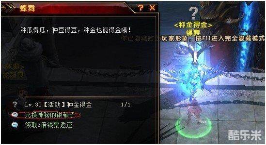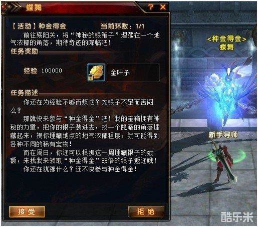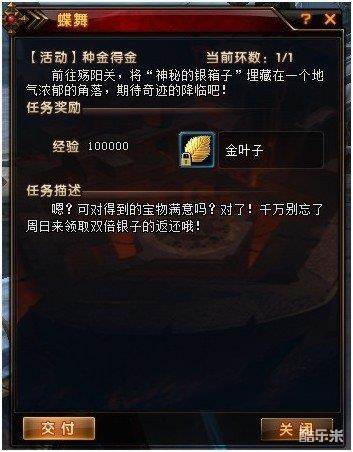 接受任务后,点击蝶舞领取“神秘的银箱子”,这里领取箱子将会消耗玩家身上的8000银票,银票不足则以银币代替;(不用担心,这笔钱你可以在周日找到蝶舞进行3倍的银票返还,不然怎么能叫“种金得金”呢?)