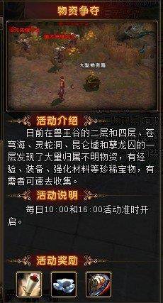 每日上午10:00和下午16:00整都会在兽王谷二层、四层,以及苍穹海、灵蛇洞、昆仑墟、虐龙囚地宫一层都会刷出1-3个大型物资箱,以及若干个小型物资箱,打开物资箱的玩家能够获得大量经验、银币、同等级装备及装备制作材料等珍稀宝物!但地宫内危机四伏,谁能挑战群雄得到珍宝呢?!