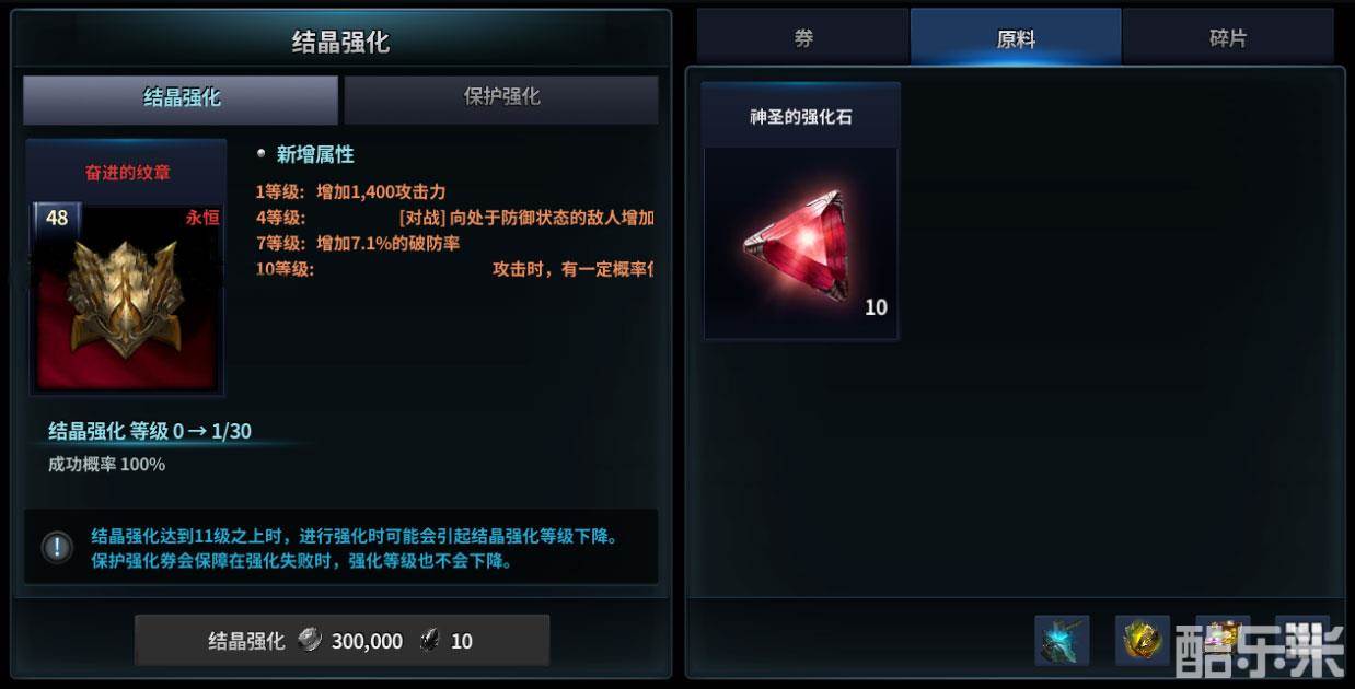 终于迎来本次更新的最大亮点了,那就是结晶强化系统了!眼尖的小伙伴可能在前面的神石图片中看到“结晶强化”这一功能栏,玩家们可以通过消耗觉醒结晶来进行属性的强化,永恒品质的神石和纹章的属性将大幅度提升,结晶的强化等级更是上限到30级!每提升到一个等级,就能获得一个未知的属性!