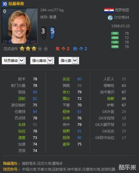 当年的追风少年,现在接班哈维,拉基蒂奇也迈入了豪门的行列。同诺伊尔一样,当年那个在矿工的小伙子,现在也有几分贵族之气。其实当时中场还是胡拉多梳理,杰梅因琼斯和马蒂普坐镇中后场,拉基蒂奇更多扮演的是配角。(但10U拉基蒂奇不亚于15拉基蒂奇了)在FIFA Online3里,10U拉基蒂奇具备了一个中场大师的几乎所有属性,有良好的传球和视野,同时远射和任意球也不赖,竟然还有6个球员称号!但实际手感要差一些,毕竟各项数据太平均,没有一个特别适合他的位置才是最大弊端,但依然值得一入。