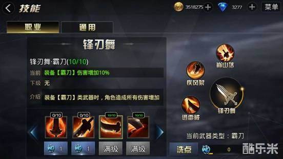 锋刃舞•重剑(霸刀):装备重剑(霸刀)类武器时,角色造成所有伤害增加。被动buff,增加伤害。PS:请注意你所使用的武器,不要点错了。推荐指数:★★★★★
