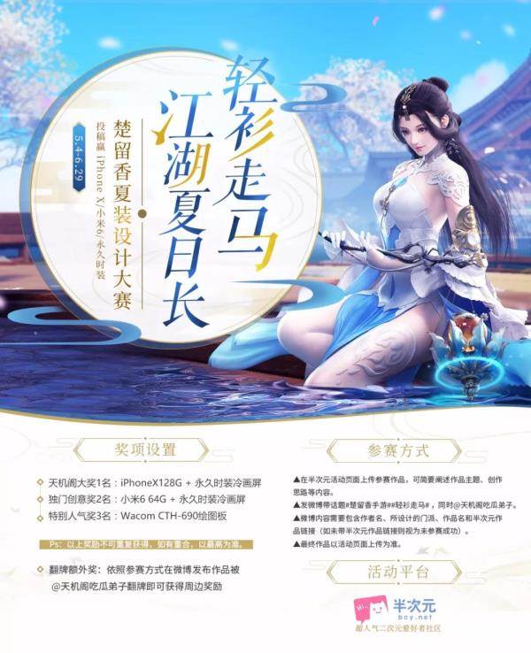 作为追求率性洒脱的江湖侠士,衣柜里怎能没有一件清凉舒爽的夏装?现天机阁邀请八方有才的玩家,亲自设计美美的夏日时装并在半次元专题内投稿,无论是色彩还是样式,把你的想法尽情表达出来吧!