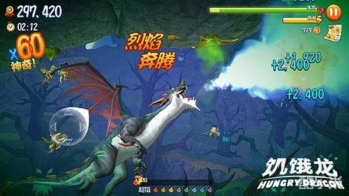 不管你吃了多少,屏幕右侧的能量条会伴随你的努力而增长,在能量续满的那一刻尽情的喷射火焰吧,带上为你增强火焰时间的宠物,来一顿香喷喷的烧烤,BOSS、蝙蝠、山羊...被火焰包围的一些生物都将成为你的“战利品”!