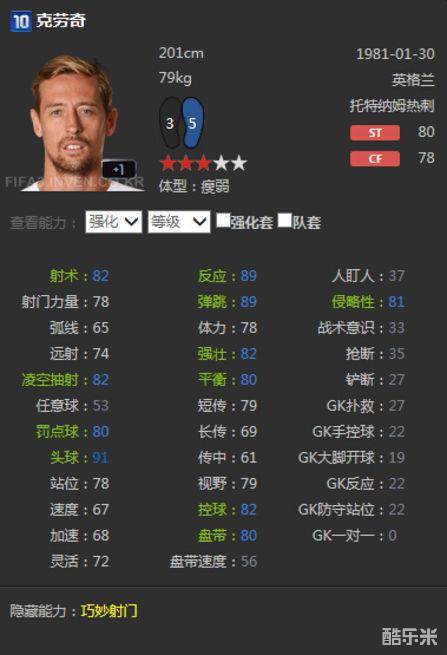 CF:加速68、速度67、盘带80、控球82、短传79、射术82、射门力量78、头球91、远射74、站位78、视野79、反应89;