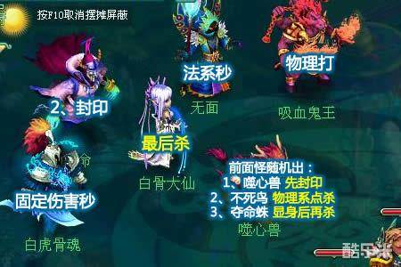推荐打法:有噬心兽先封印,接着封印无命和吸血鬼王;有草上飞就先集中火力杀掉,接下来有不死鸟物理系点杀,杀死后继续杀吸血鬼王,法系杀无面,如果一切顺利现在场上只剩下主怪,无命,骨魂,或者还有只刚结束隐身的夺命蛛,按照夺命蛛,无命,骨魂,主怪的顺序一一击杀,杀无命不要用物理单体攻击。
