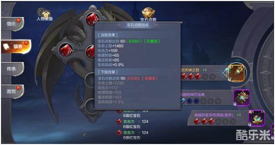 宝石点数,计算角色、坐骑身上的宝石数量。宝石镶嵌数量越多,宝石点数越多,角色血量增长百分比就越大。像魔法师、弓箭手这类血量不算厚的职业,可以多注重这方面的培养,提高血线。而高血高防的战士也可以培养,扬长避短,更厚的血,扛更疼的伤害。