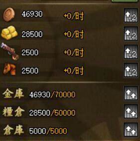 战国之野望这里是城内资源信息区域,提示包括当前资源、资源产量、存储上限等信息,同时可以花费金币进行产量及存储翻倍的效果,该效果持续一局游戏(一个战区)