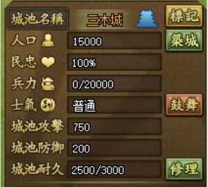 这些是战斗相关的信息区域,同时可进行快速筑城、鼓舞士气、修理城防等功能: